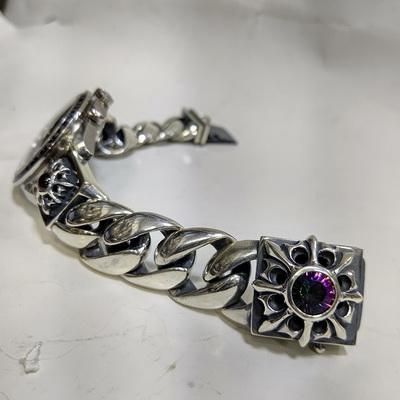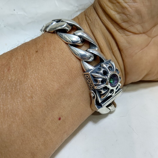 The bracelet combines heavy silver links with refined details: