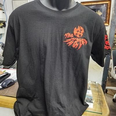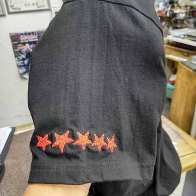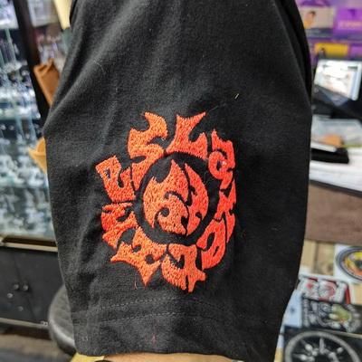 100%コットンの高級ブラックTシャツ。手作業で仕上げられた刺繍が特徴で、ブランド The Slayer を象徴する、力強く唯一無二のデザイン。
